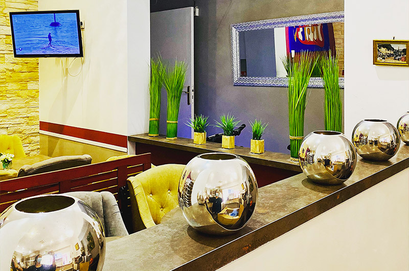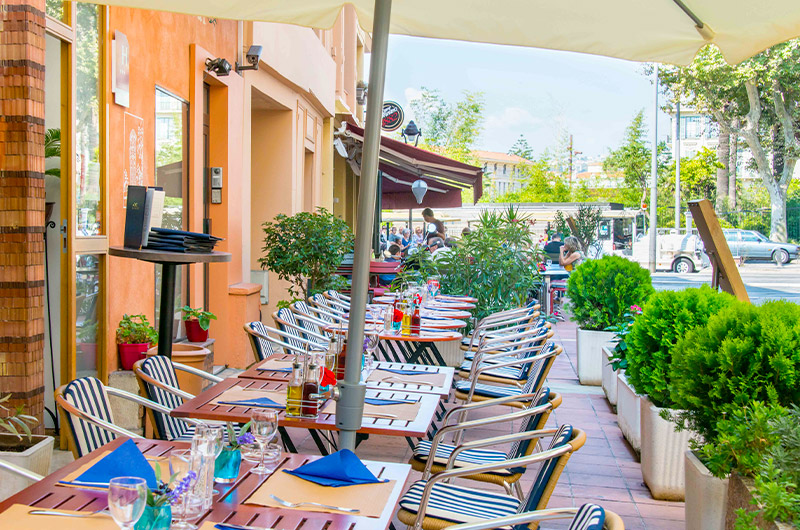 Une élégante façade colorée surmontée d'une tour, une grande terrasse ouverte sur une ruelle pittoresque du Vieux Nice et le cadre contemporain d'une salle à manger lumineuse, le décor est planté...